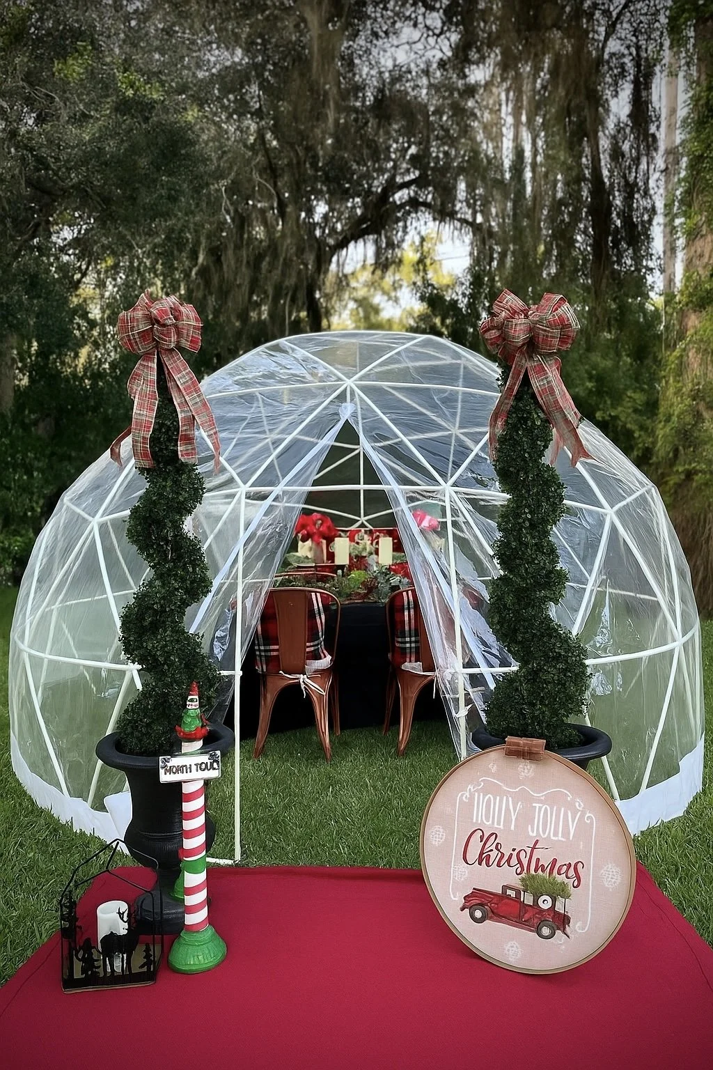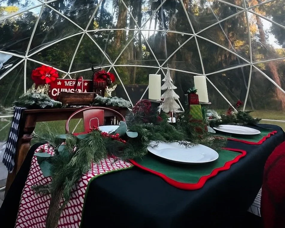 Step into a holiday experience unlike any other—where the magic of the season unfolds inside one-of-a-kind geodesic domes. At St Johns Snow Globes, the best Christmas stories begin around a beautifully set table, surrounded by warmth, flavor, laughter, and wonder. Whether you're planning a romantic date, a festive family outing, a joyful get-together with friends, or a memorable corporate celebration, our enchanting domes offer the perfect escape from the ordinary and a chance to create unforgettable memories.